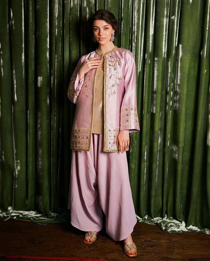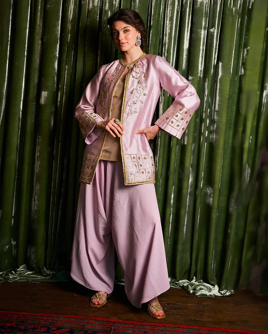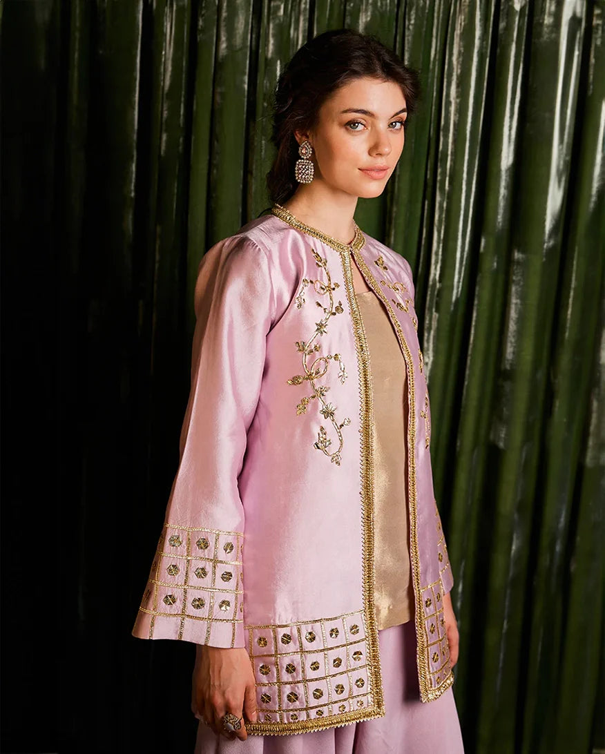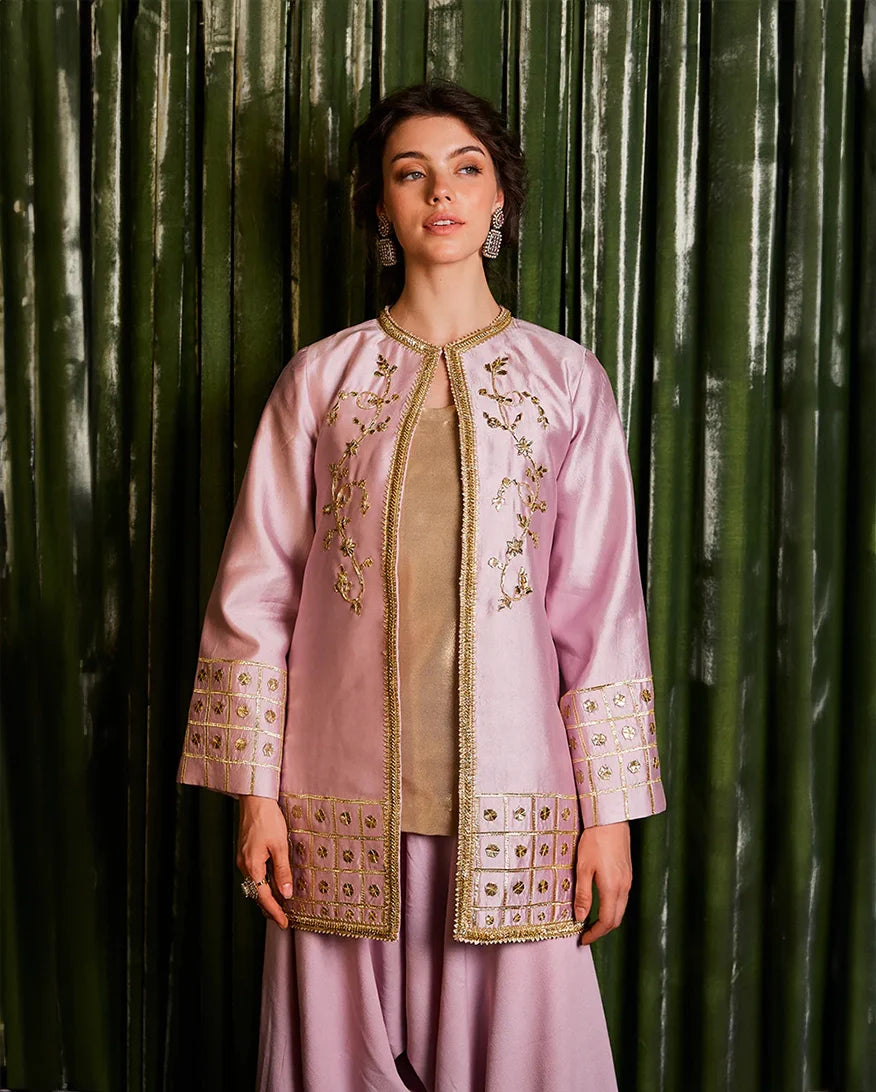 A delicate charm unfolds with "Sanjh" - a raw silk ensemble adorned with intricate gota details, perfect for timeless elegance.