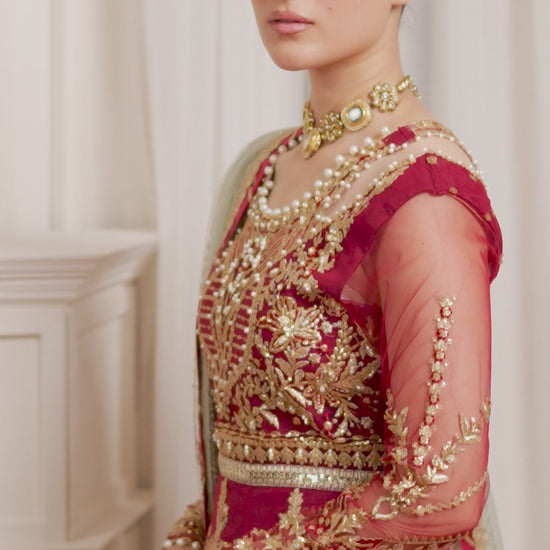 Bold and captivating, Scarlet exudes timeless allure with its deep red hue, adorned with intricate embroidery and shimmering embellishments. A striking ensemble designed for those who dare to make a statement.