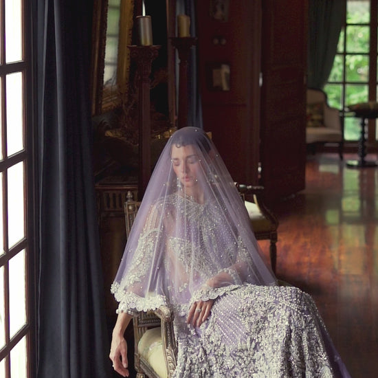 Introducing Seraphina, a celestial creation that will transport you to a realm of celestial beauty. This bridal outfit is a symphony of hand embellished Swarovski crystals, and sequins, meticulously arranged to form intricate floral motifs that dance in the light. The illusion neckline and sheer back, add a touch of sensuality, while the voluminous skirt, creates a dreamy, fairy-tale effect. Seraphina is a testament to the art of couture, designed for the bride who desires nothing but the extraordinary.