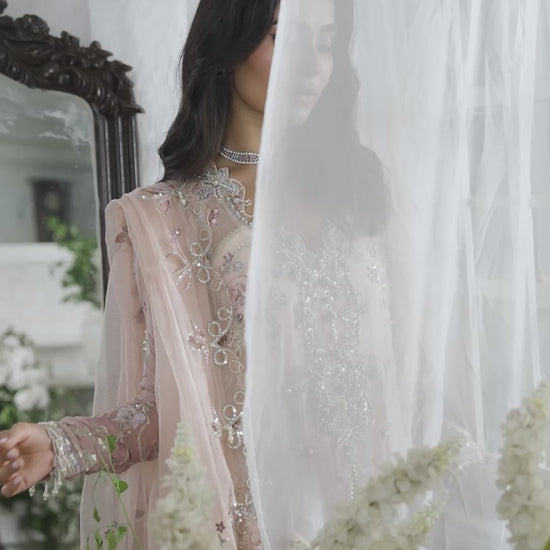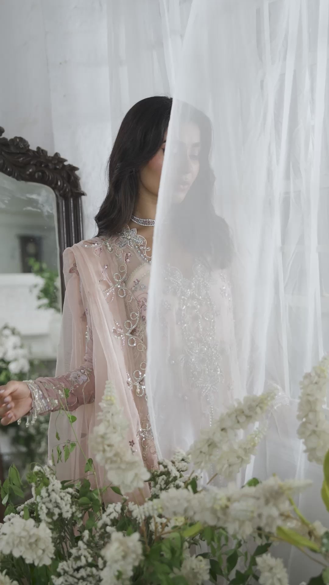 • Embroidered, sequinned pearl embellished front daman border (organza)