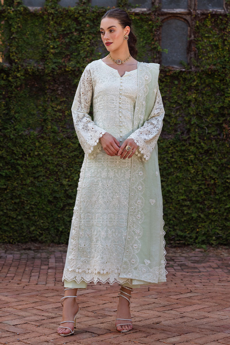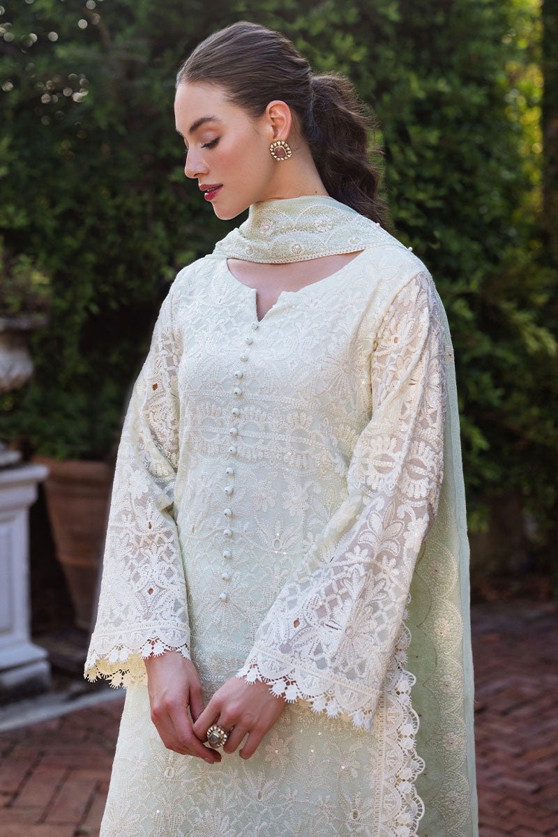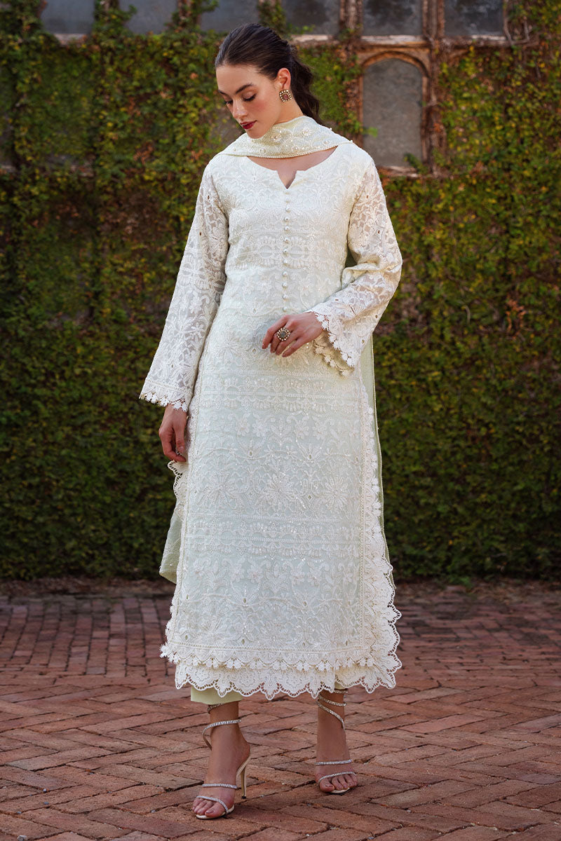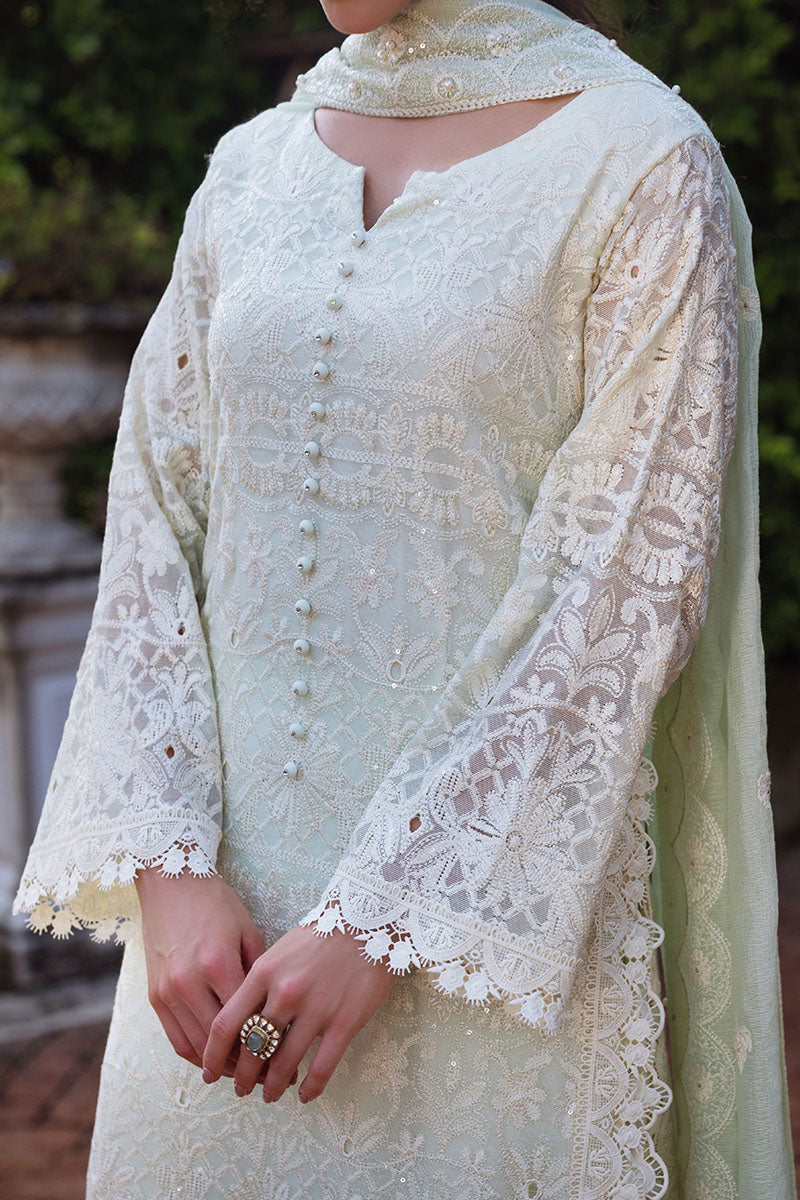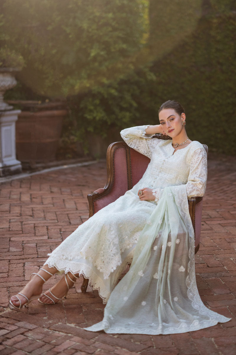 Simin, where every thread weaves a tale of refinement and poise. This 3-piece ensemble is a work of art, adorned with intricate Chikankarri embroidery, delicate sequins, and pearl embellishments, crafting a masterpiece of understated luxury. This is a 3 pc outfit.