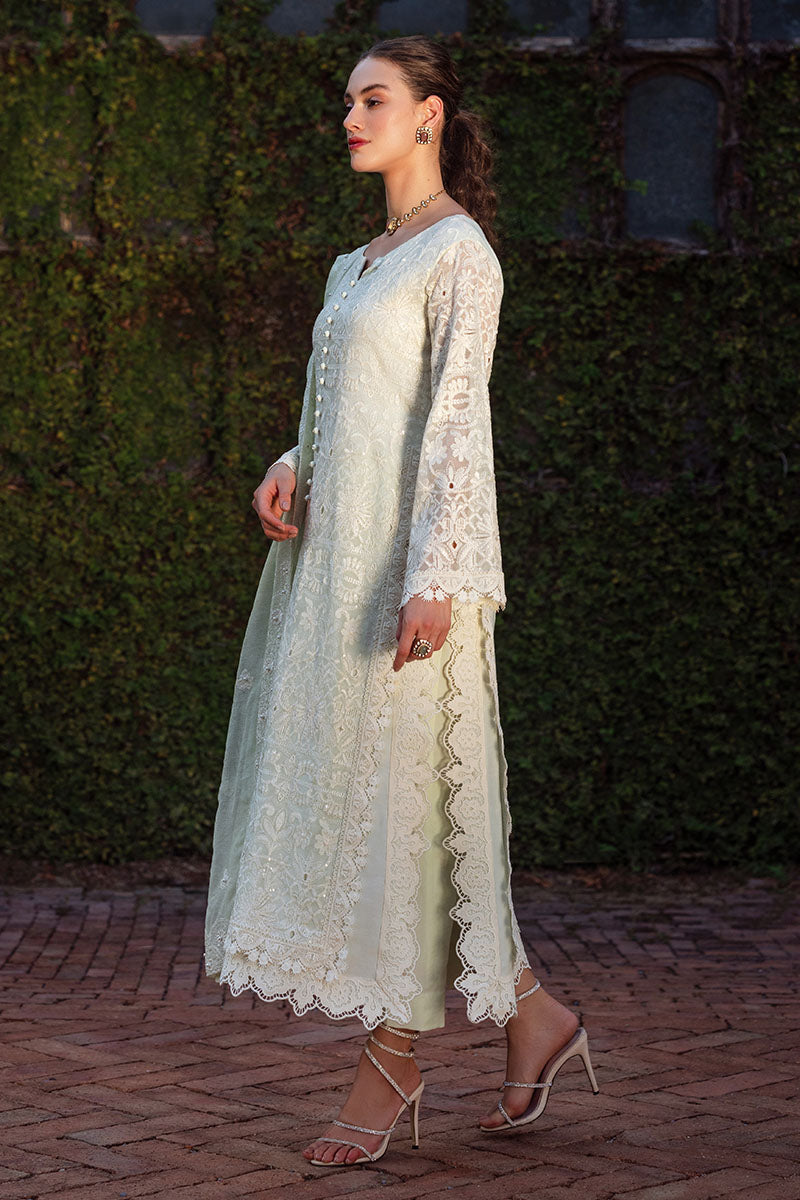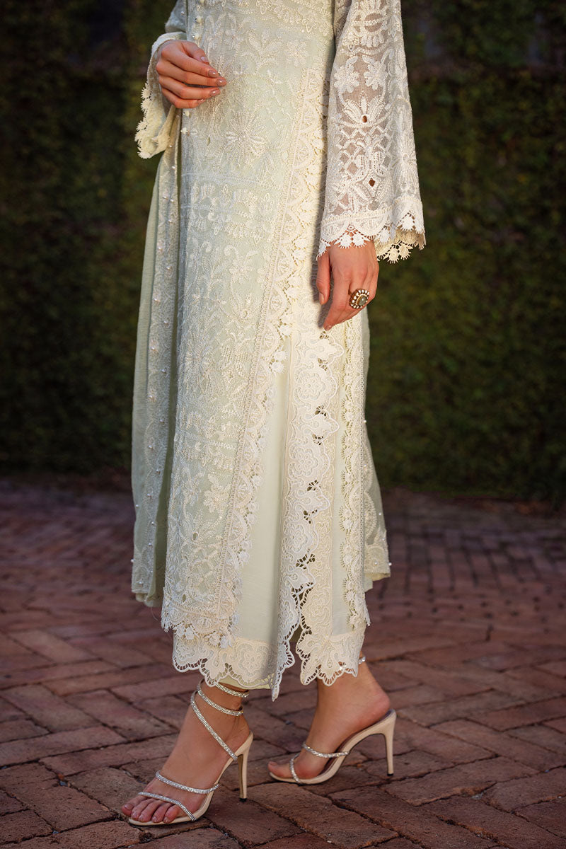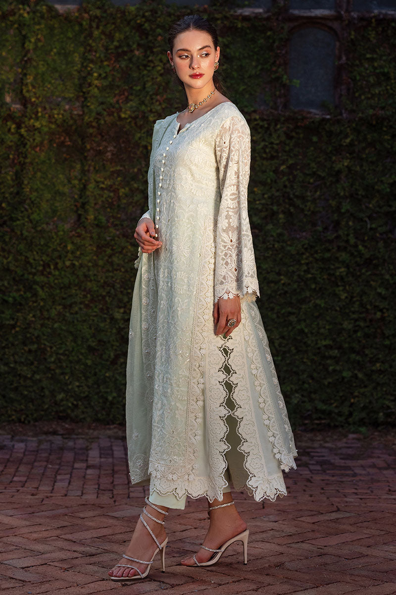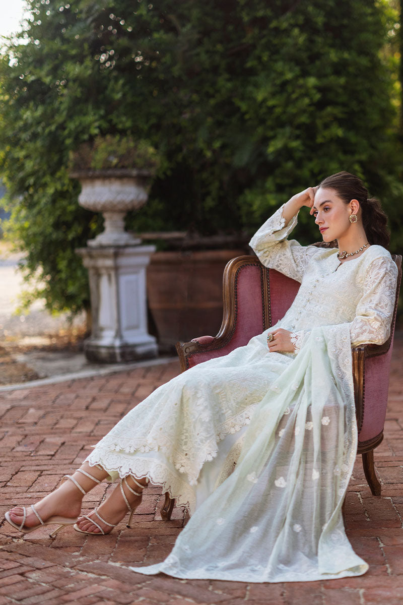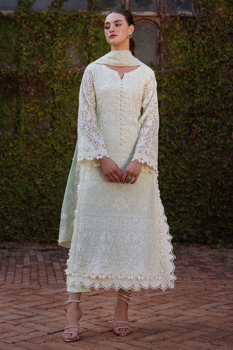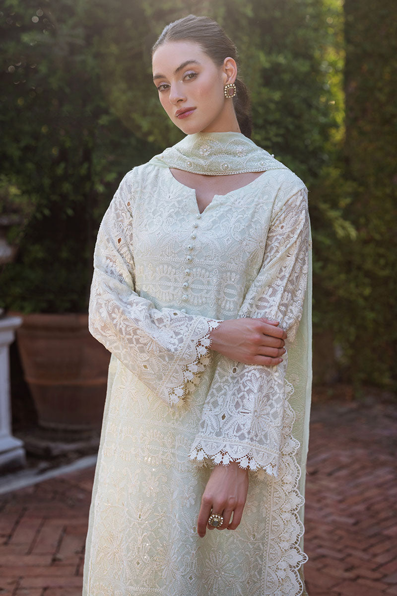 Simin, where every thread weaves a tale of refinement and poise. This 3-piece ensemble is a work of art, adorned with intricate Chikankarri embroidery, delicate sequins, and pearl embellishments, crafting a masterpiece of understated luxury. This is a 3 pc outfit.