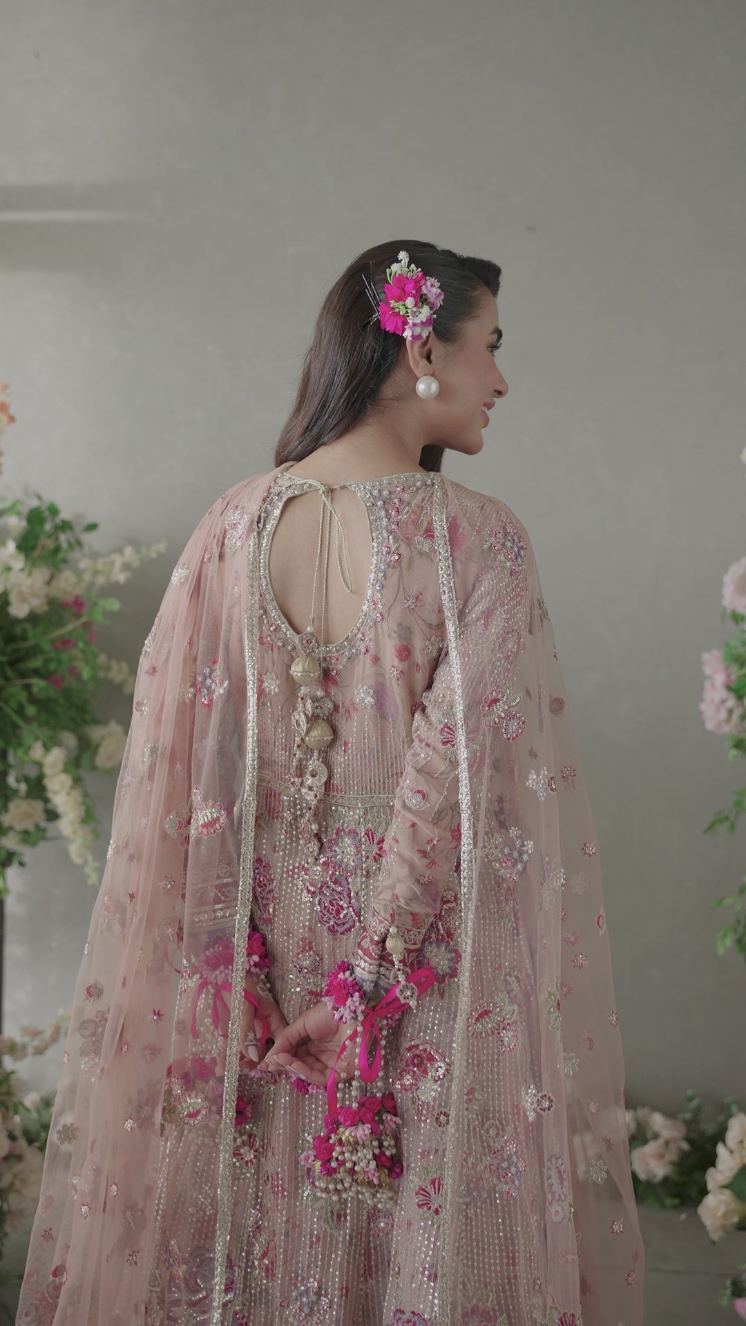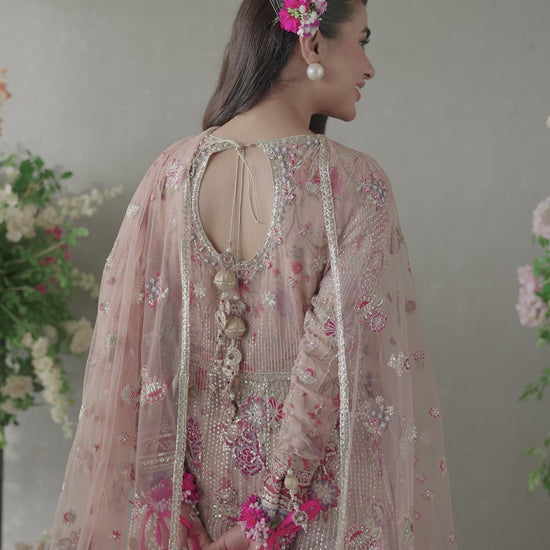 Our ensemble Sona offers a stunning blend of sophistication and glamour. Crafted from printed chiffon with intricate hand-embellished details, it exudes timeless elegance. The ensemble is complemented by a net dupatta, adorned with exquisite embroidery and sequins, adding a touch of dazzling refinement to your look.