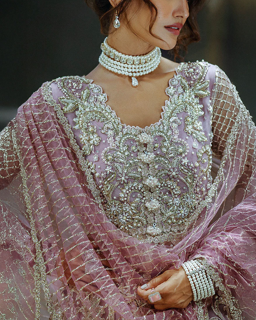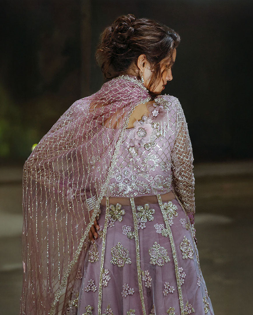 Step into timeless elegance with this beautifully crafted ensemble. Featuring intricate embroidery, sequins, and hand embellishments, every detail is thoughtfully curated. Complemented by a sequinned net dupatta, dyed raw silk lehenga, and handmade tassels, it’s a unique piece that blends sophistication with individuality.