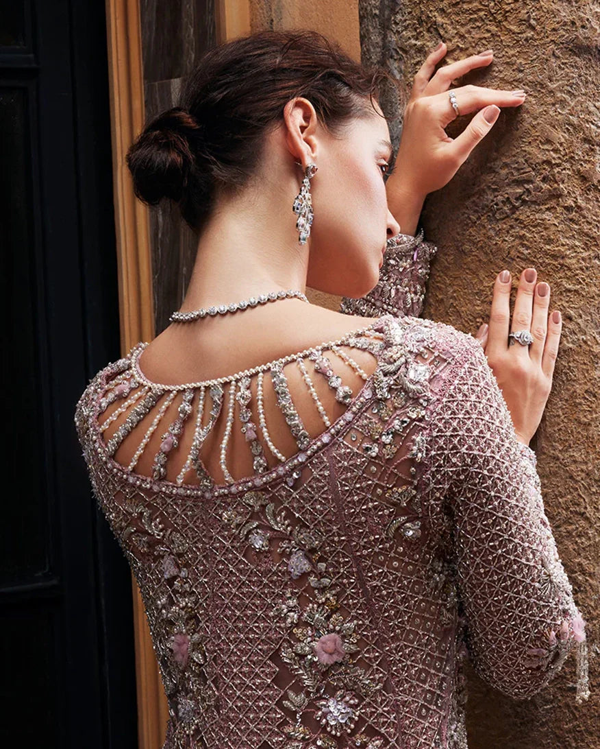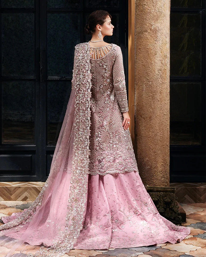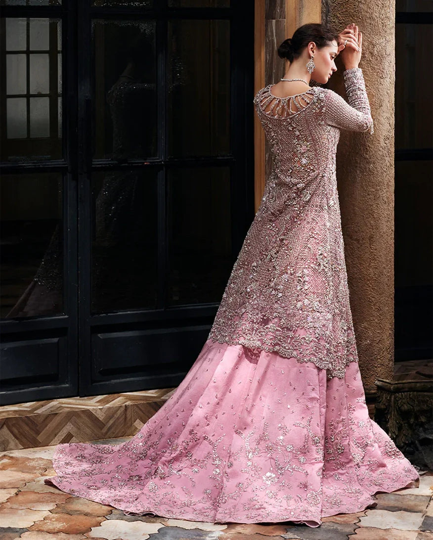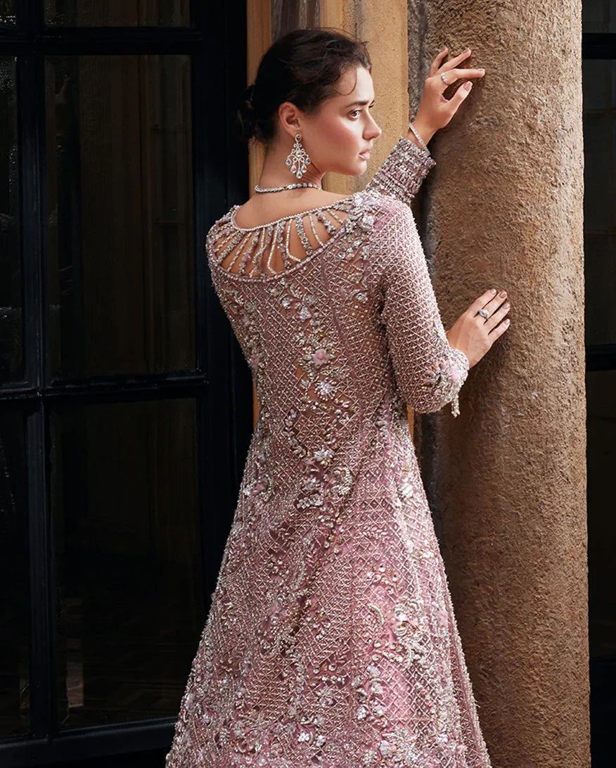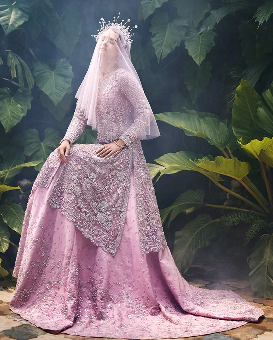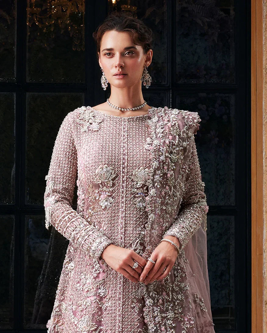 Zarim, an ethereal ensemble is a celebration of tradition and contemporary fashion, perfect for the modern bride who appreciates timeless beauty. The ensemble is adorned with delicate sequins and naqshi work that shimmers with every movement, thus creating a mesmerizing effect. The stone work, intricately placed, adds a touch of opulence and glamour, reflecting light in the most captivating way.